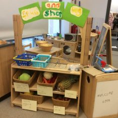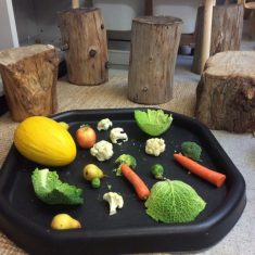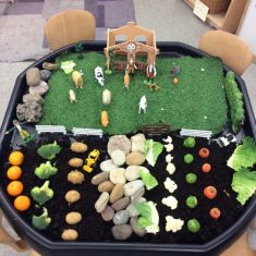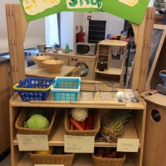 Once back at school we then turned our home corner area into our own fruit and veg shop. We made labels with the names and cost of each item. We have also made our own farm area using soil, fruit and vegetables. Our investigation area has a tray with different fruits and vegetables on which we are going to look at, touch and discuss.