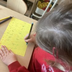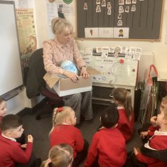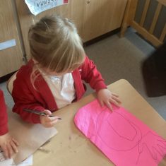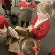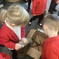 A mystery egg was delivered to nursery. We researched what could be inside it. We used the internet to find out, and we looked in books. Next we made our own book about animals that come out of eggs. Some of us decided we should make a nest for the egg. We made signs so that no one would touch the egg incase it got damaged. Two of us decided they would take on a security role and guard the egg. After a few days the egg hatched. It was an apatosaurus! Now we are going to find out about dinosaurs. How exciting! Article 28