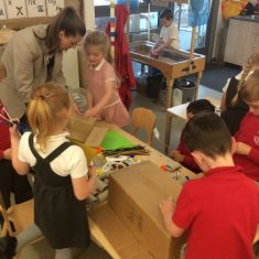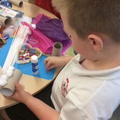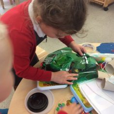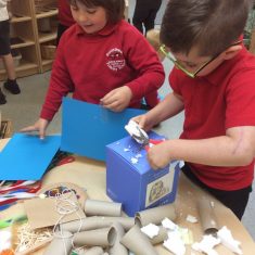 Then the exciting part! We spent the morning making our own inventions! We used boxes, egg containers, toilet roll tubes, feathers, paint, glitter and lids to name just a few! Take a look at what we came up with…
