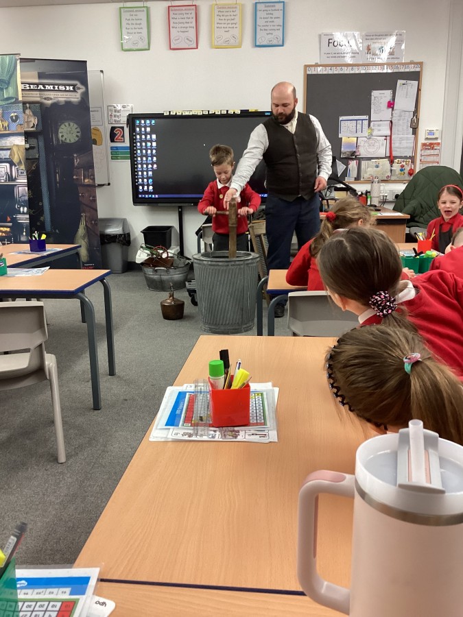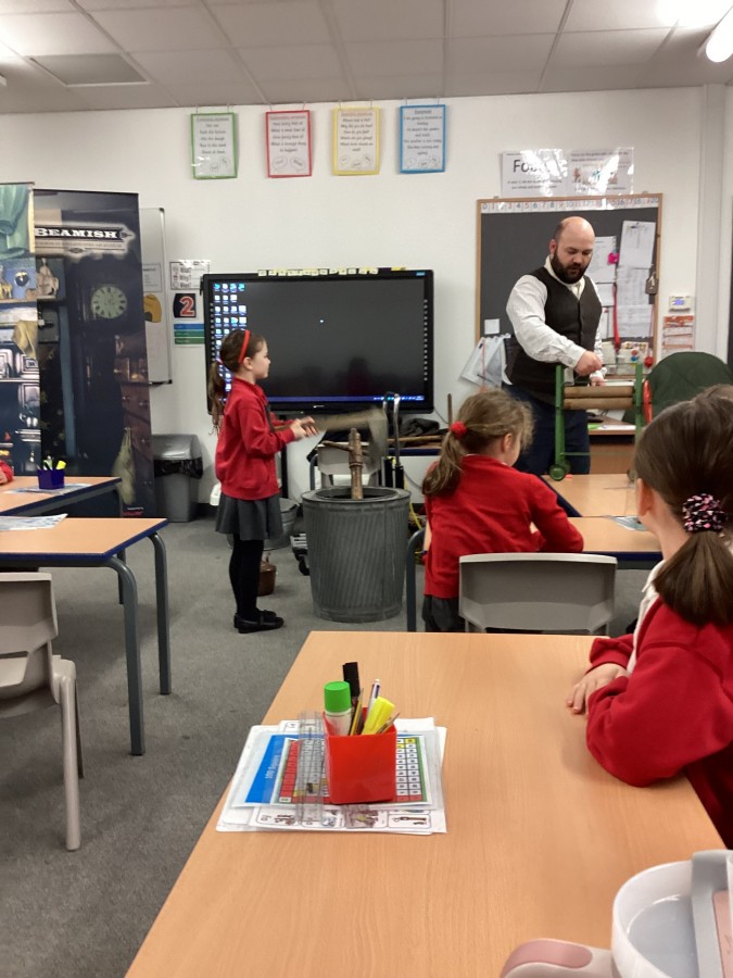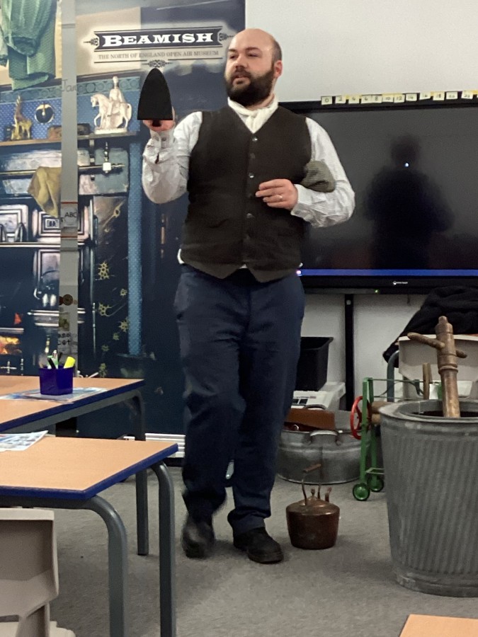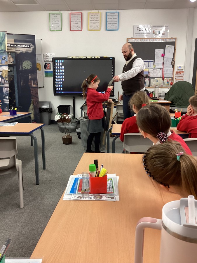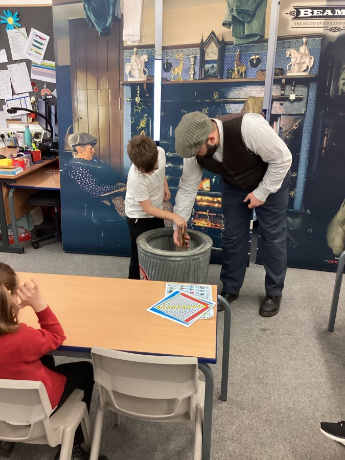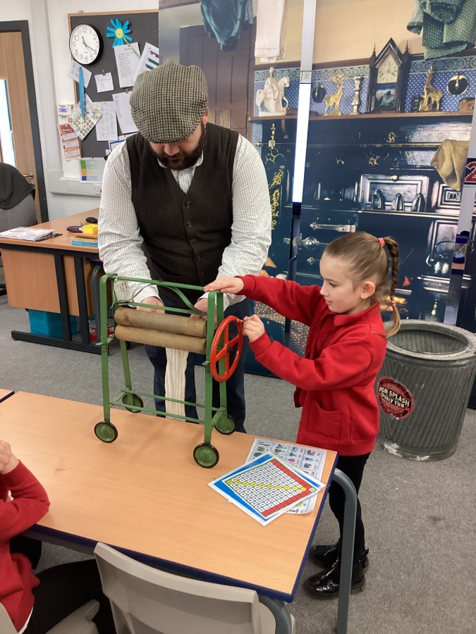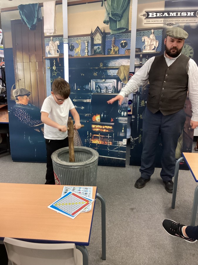 Beamish came in to visit us yesterday for the start of our new topic in History, houses and homes. We learnt about what life was like in the recent past. Did you know that all buttons have to be taken off shirts before wash day to prevent them cracking in the mangle, then had to be sown back on when the clothes were dry!