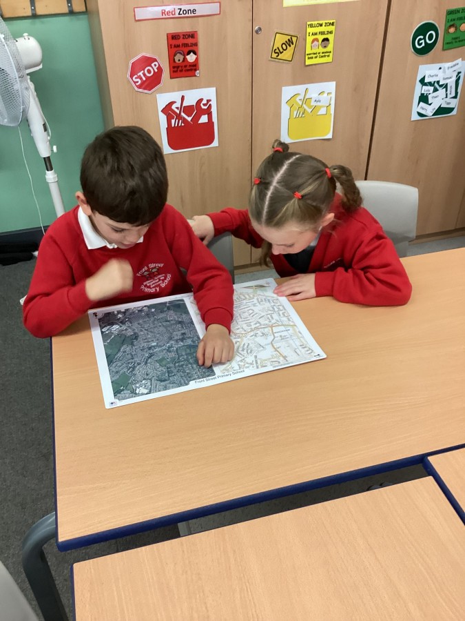 Year 2 used their geographical skills to locate features in their local environment on different maps.