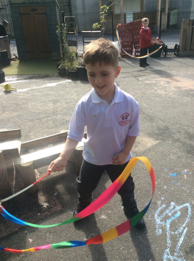 Today we all went outside for ‘Fitness Friday’.  We enjoyed moving to the music using pom poms and ribbons to work on…