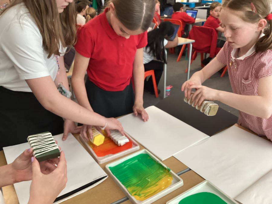 Printing techniques 9 May 2024 After using mono printing techniques to create an image, the children in Year 5 explored creating string print designs. Miscellaneous The Arts Year 5