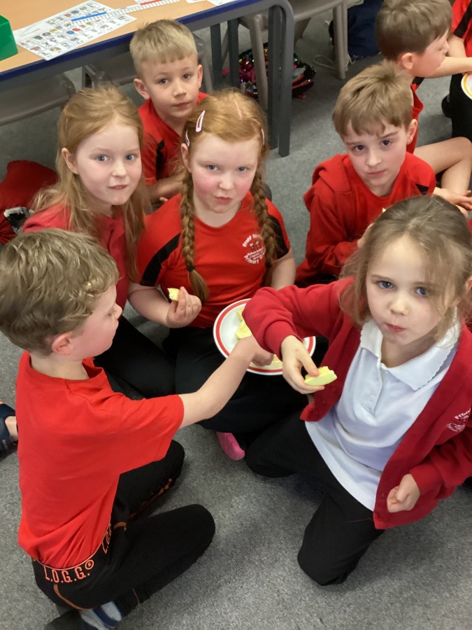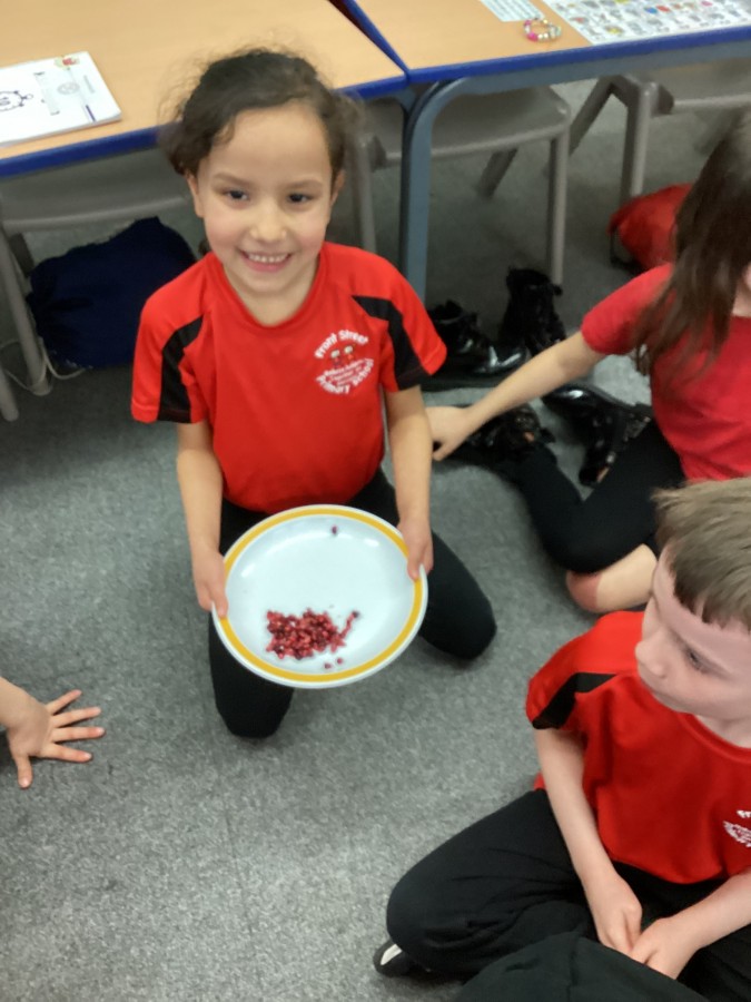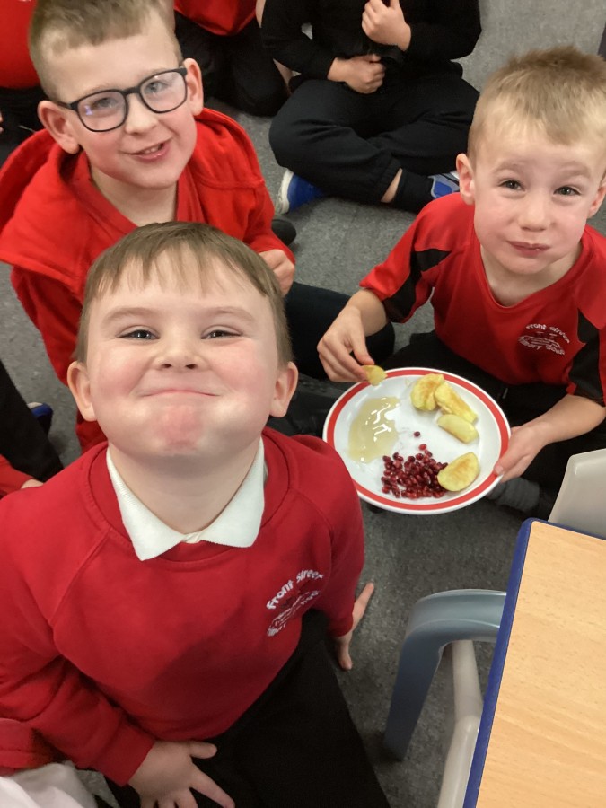 The children tried some foods that Jews eat during this celebration and discovered why they are eaten. They tried pomegranate, honey and apples.We found out that the number of seeds in the pomegranate signifies the number of good deeds they must do that year!