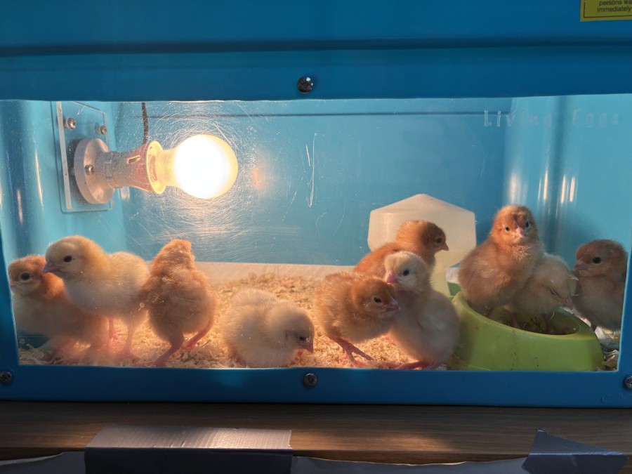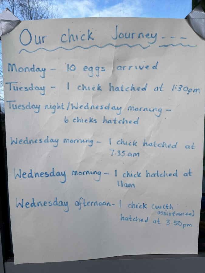 We hatched 10 chicks! We recorded the day and time they hatched. We named the chicks with a voting system and enjoyed learning about the life cycle of a chick, how to look after, clean, feed and handle the chicks.