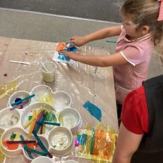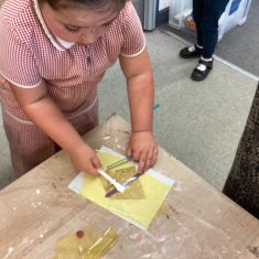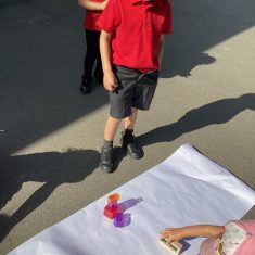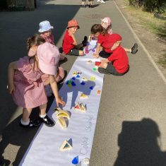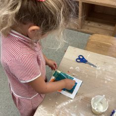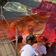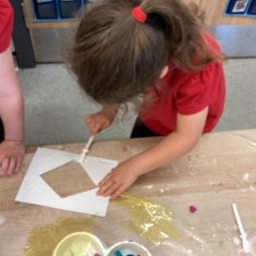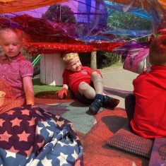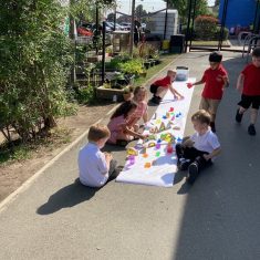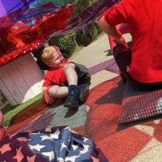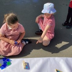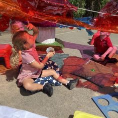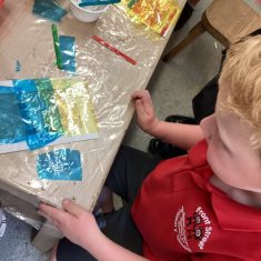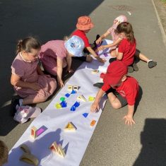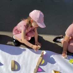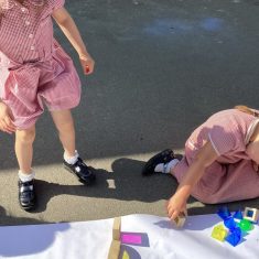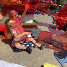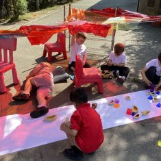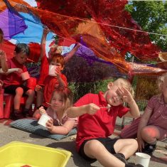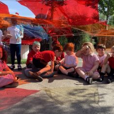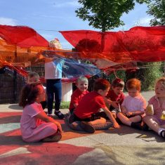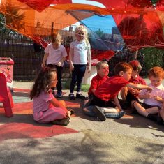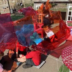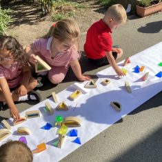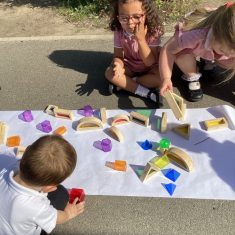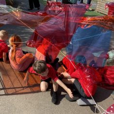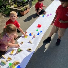 Today was such a sunny day we decided to investigate shadows using coloured shapes and then made a cellophane den! It was lovely sitting in all of the coloured shadows! We made some smaller colour catchers onside to take home and put on our windows.