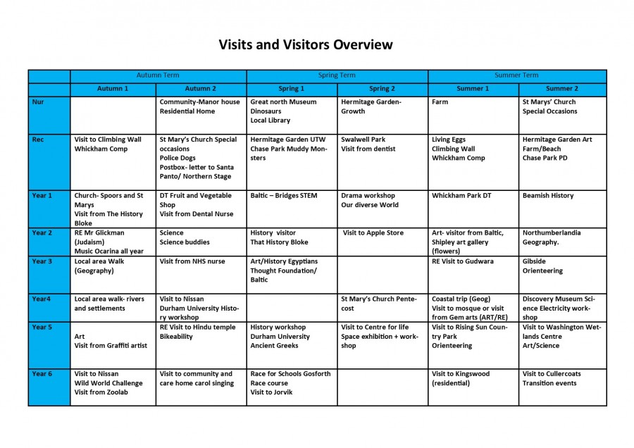 Each term teachers plan for visits or visitors to ensure children have real experiences to inspire their learning. This year’s plan can be found here and may be subject to change.