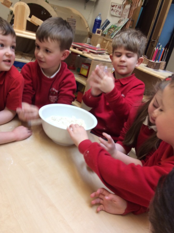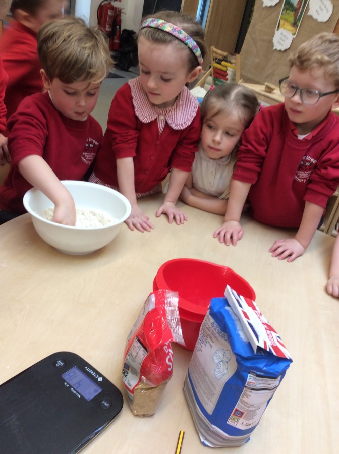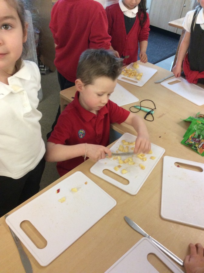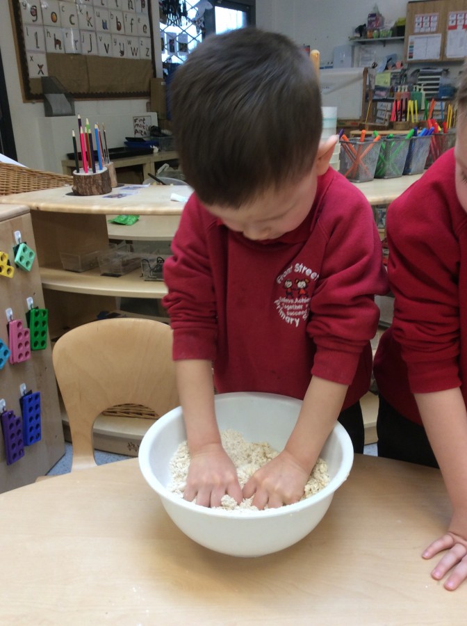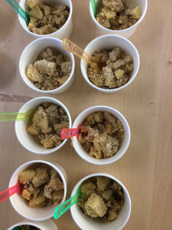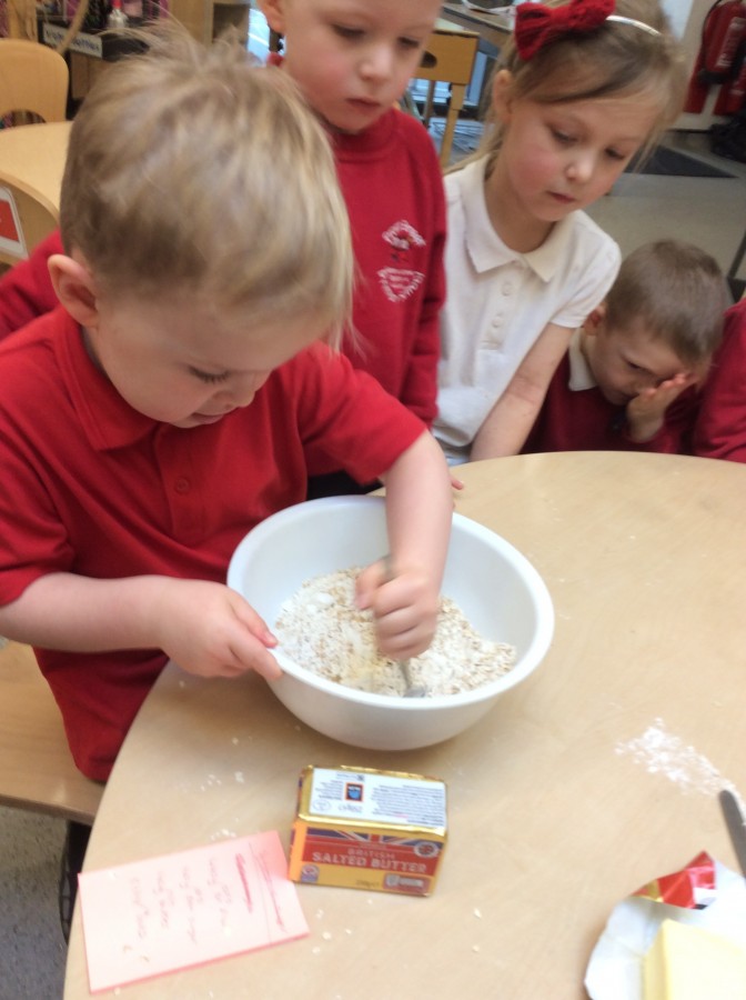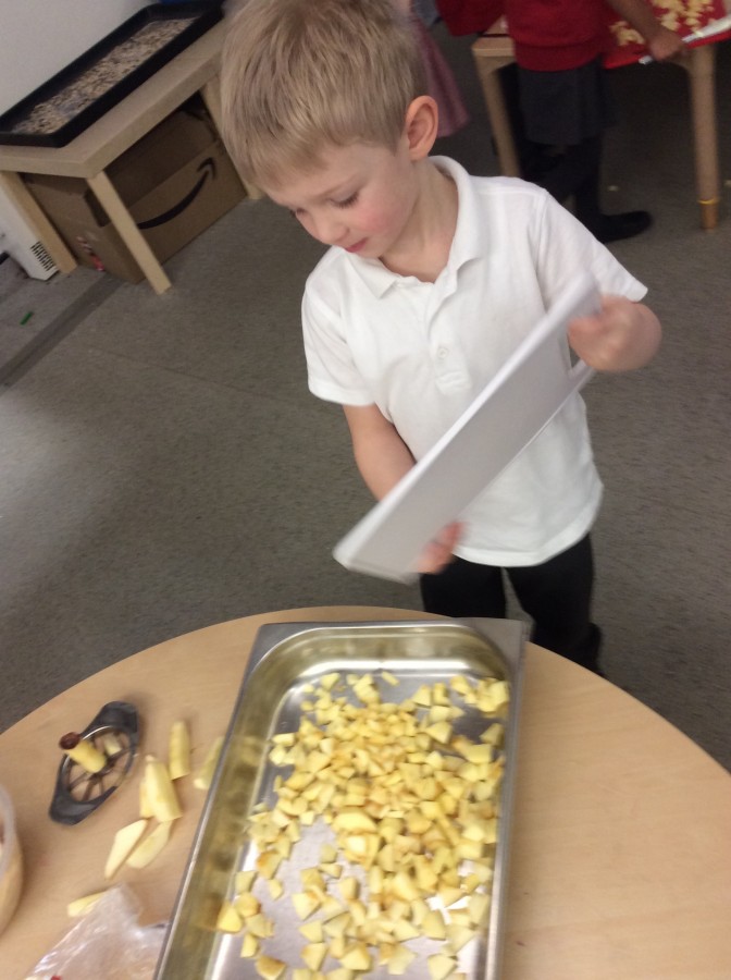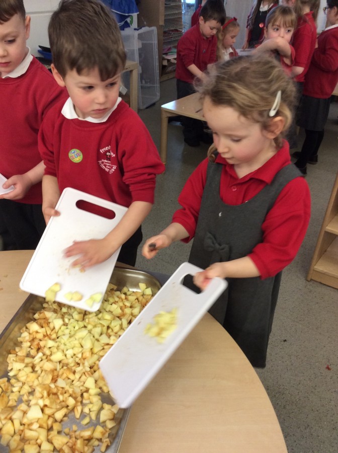 To end our week on ‘The Gruffalo’ we made some Gruffalo crumble. We chopped up the apples and rubbed the butter, sugar and flour together to make the crumble. We hope you all enjoyed eating it!