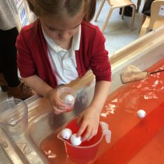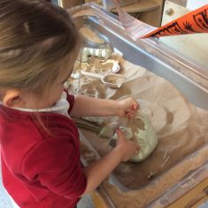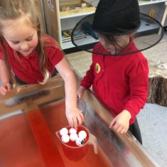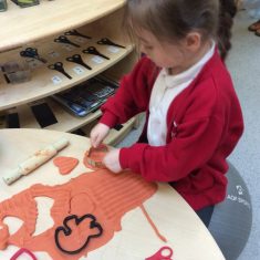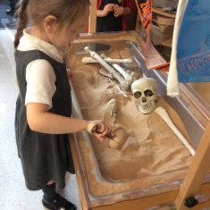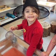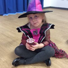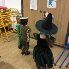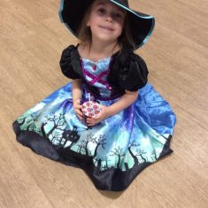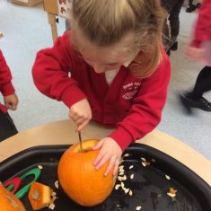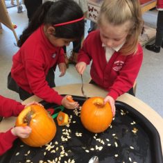 We used our fine motor skills to stretch elastic bands around pumpkins, we painted ghost hand prints and made paper pumpkins. We also loved finding the Skelton bones in our sand pit! In our role play area we have dressed up and had fun making witches potions. Our independent writing this week was based around our Halloween costumes.