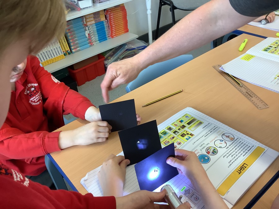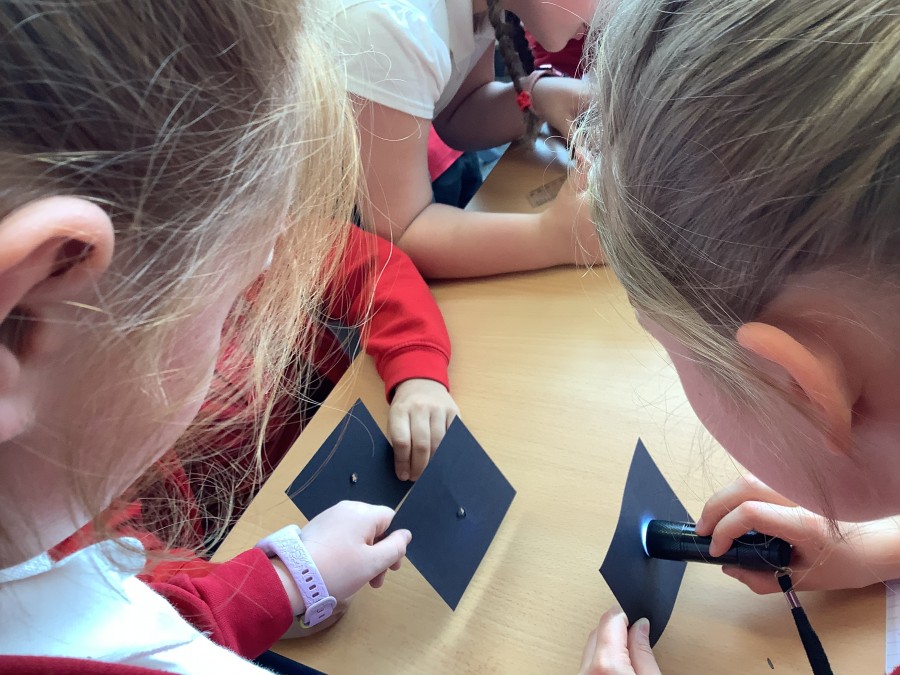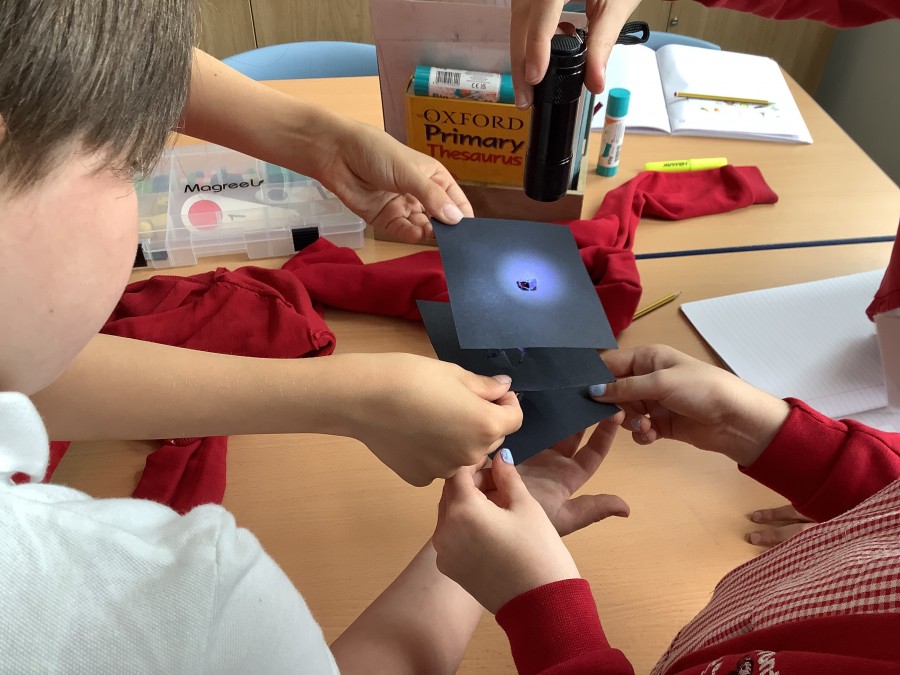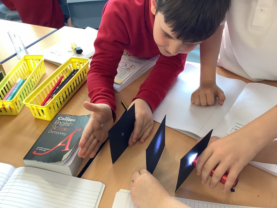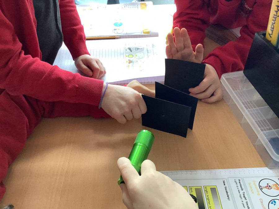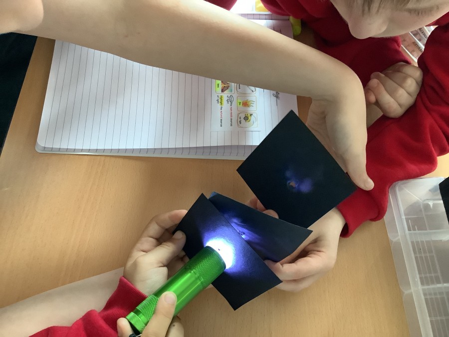 Today in year 3, we started our science unit all about light. We learned that without light, we cannot see anything. We know that light sources can be naturally there (like the sun) or manmade (like a light bulb). We explored the theory that light travels in straight lines and proved with three pieces of card and a torch that it does!