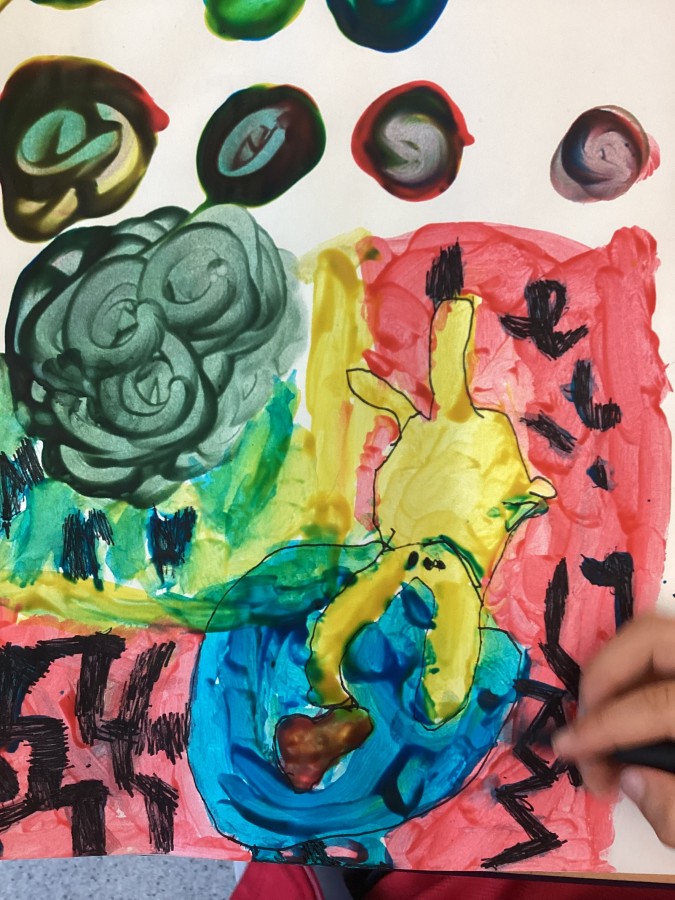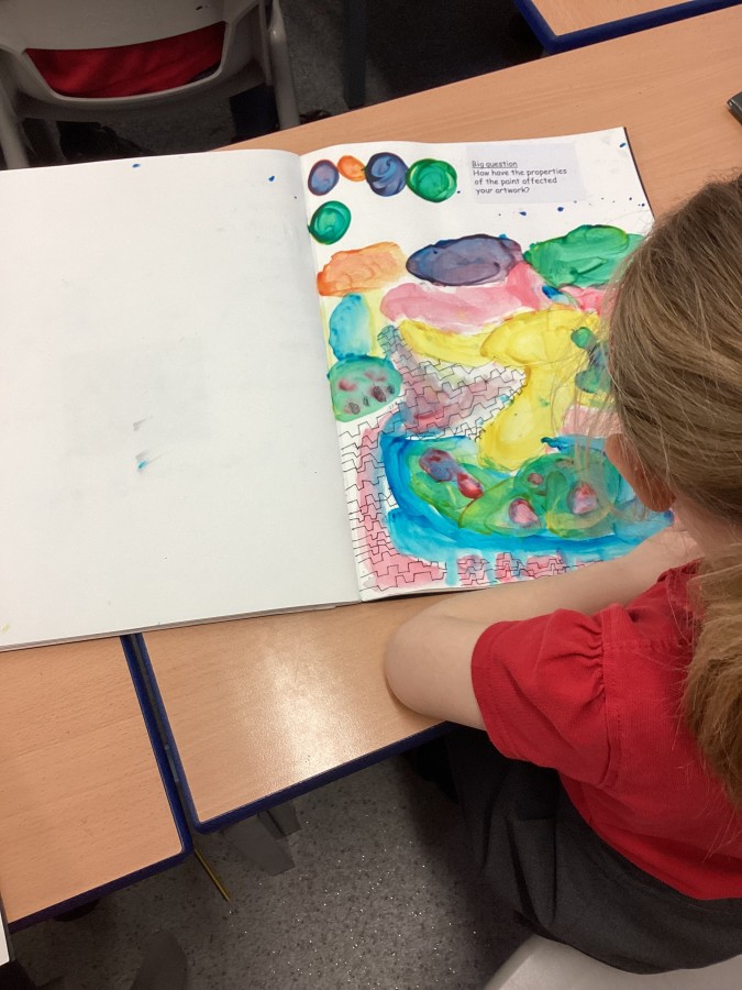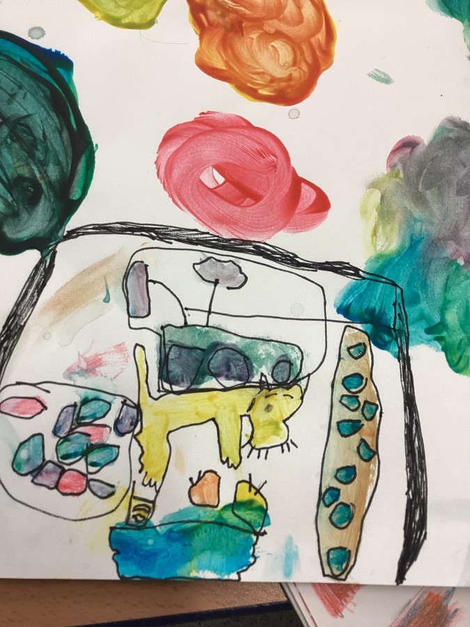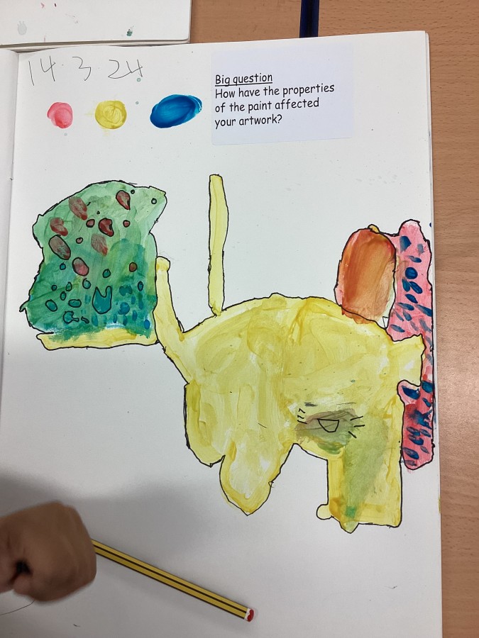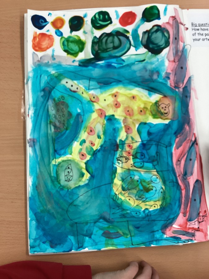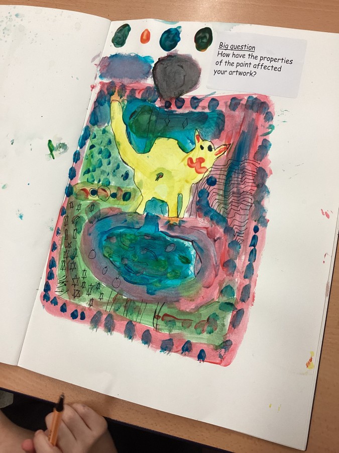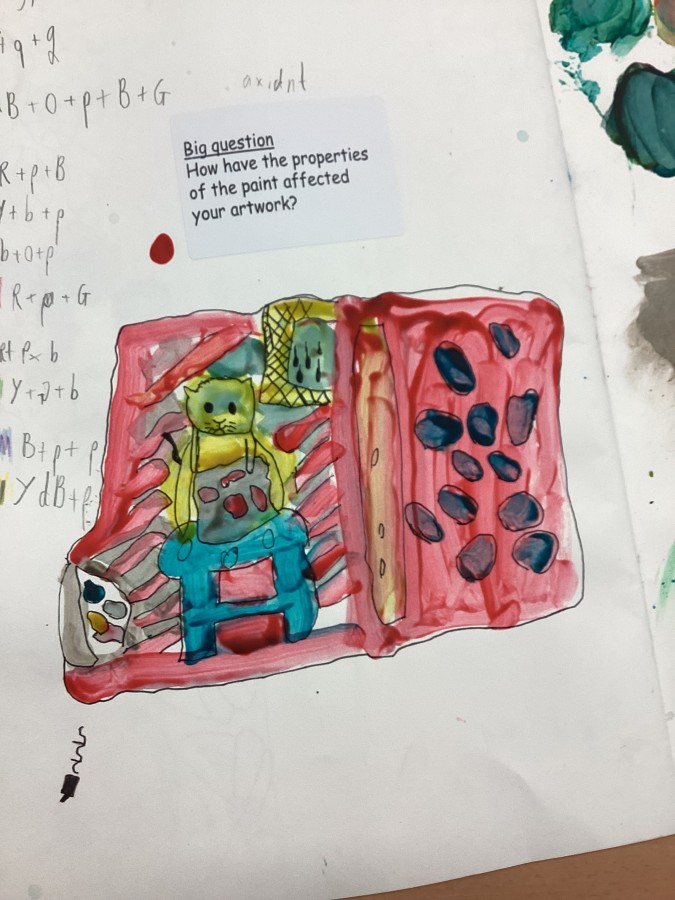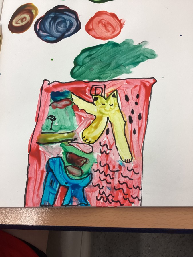 Yesterday we used primary colours to make secondary colours, today we finished our painting inspired by Matisse “The cat with the red fish”.