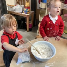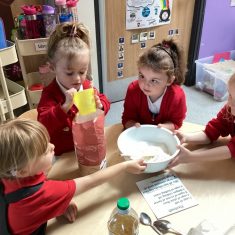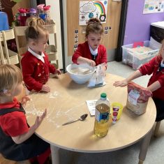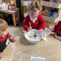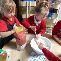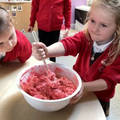 We enjoyed making our own playdough in nursery. We followed a recipe, counting out how many scoops or cups of the ingredients we needed and took turns. We chose pink this week. What a fabulous team effort. Well done! Article 28