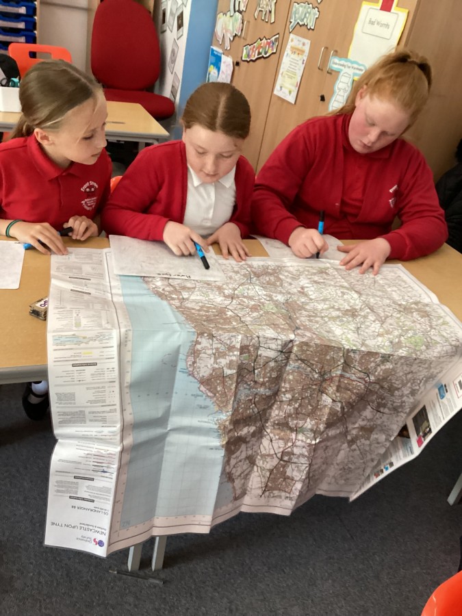 In Geography, we are learning about Rivers. We used OS maps to locate the source and end of the River Tyne and where the tributaries of the Tyne meet.