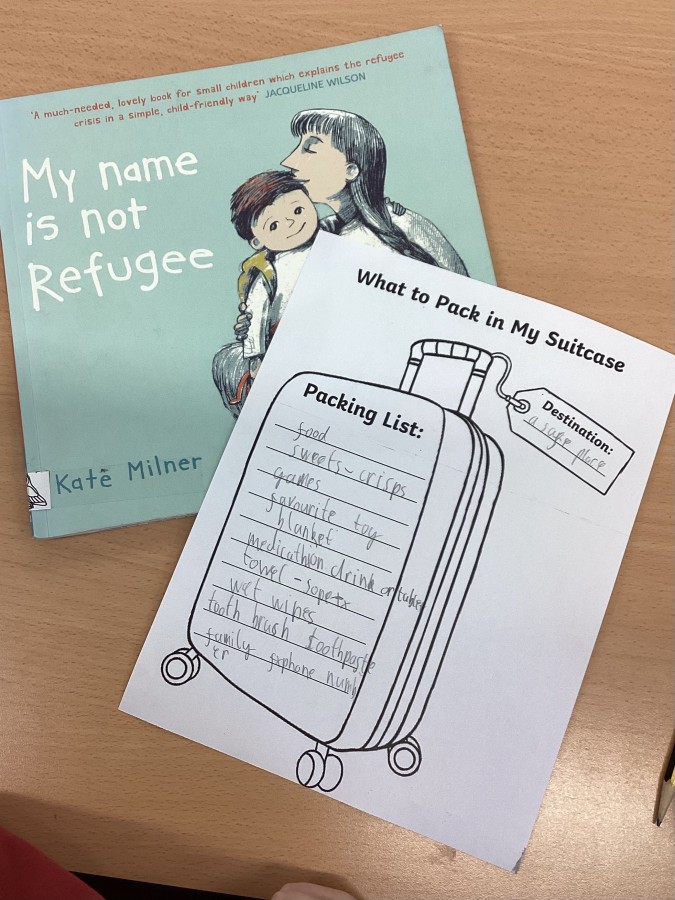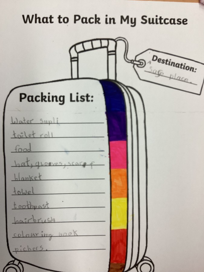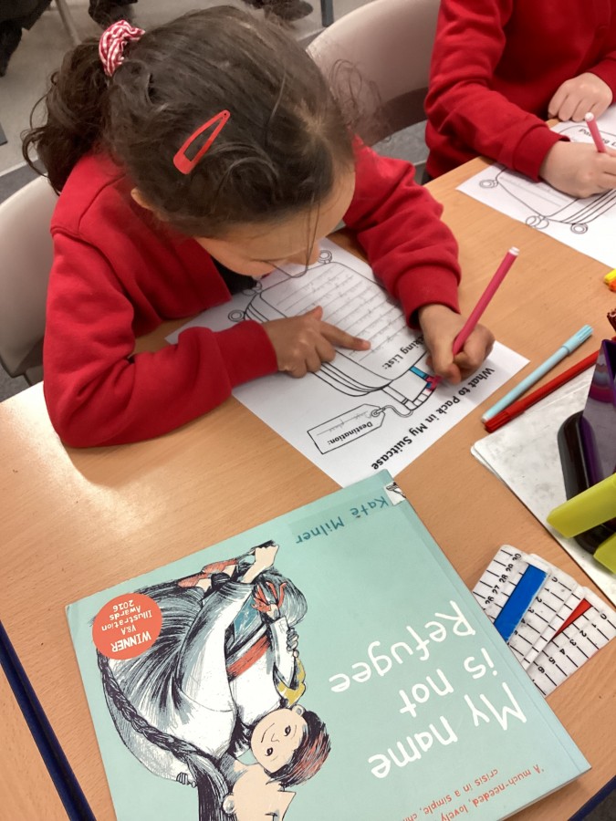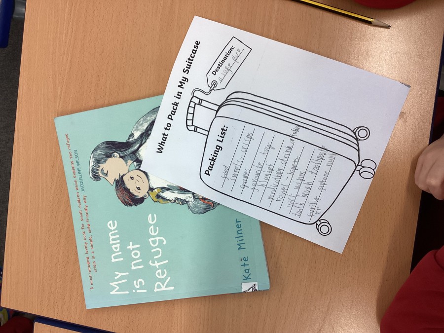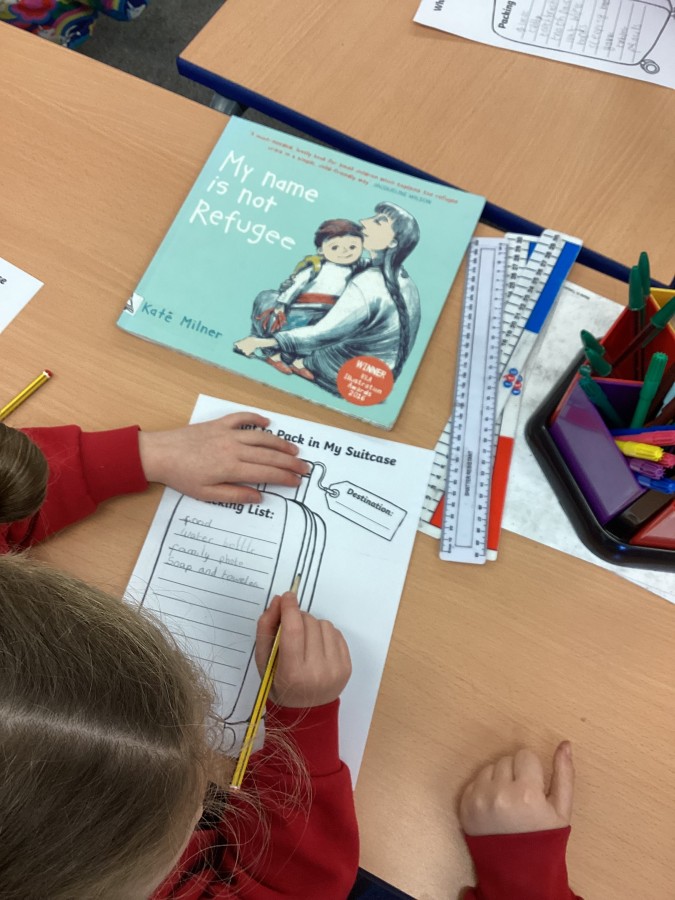 Today we read the book ‘My Name is not Refugee’ by Katie Milner. We discussed are basic rights to be safe and protected from war. (article 38) We imagined what it must be like to leave a country where it is not safe and to go to another country. We thought of some basic items to pack for the journey which could keep us clean healthy and help to remember our home. Article 4,6,7,8,9, 10, 18, 19, 22, 24, 26, 27, 28 and  30.