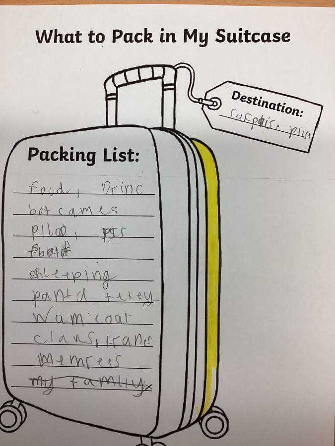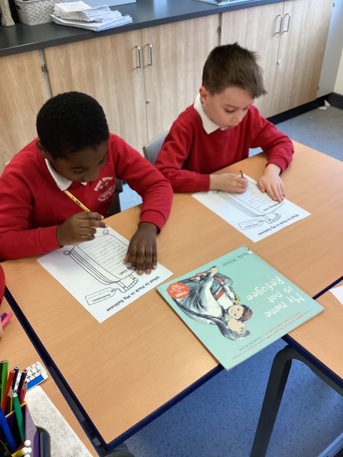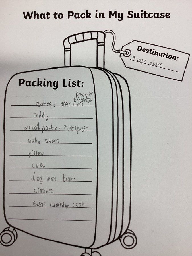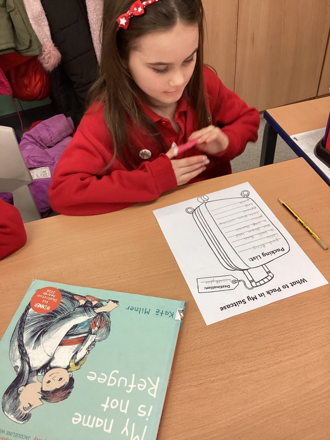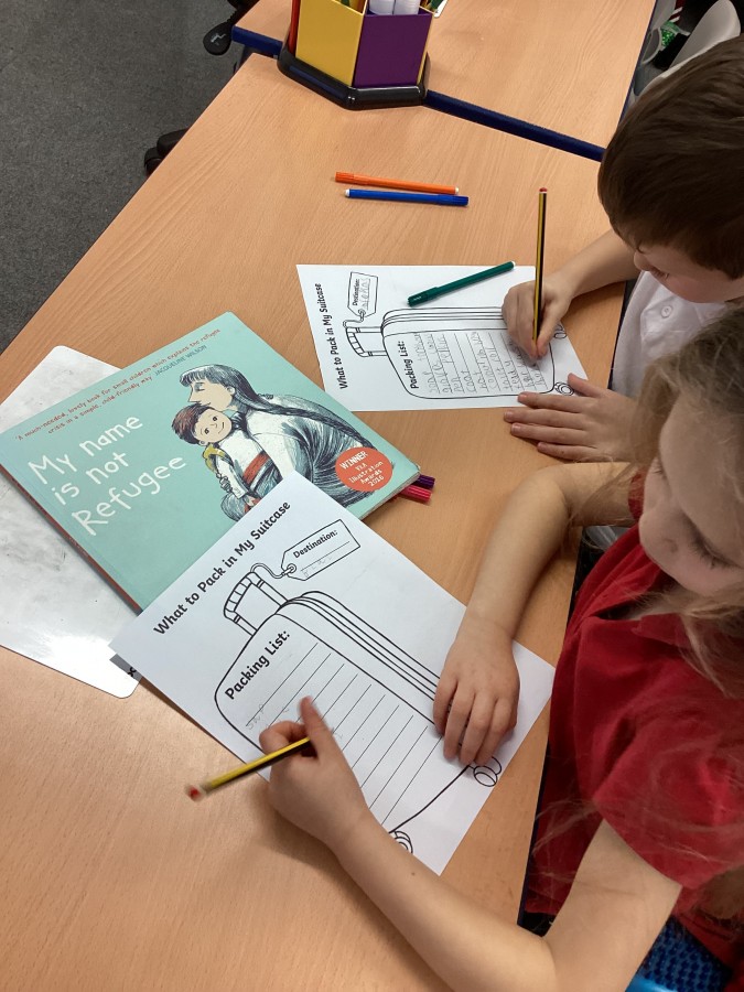 Today we read the book ‘My Name is not Refugee’ by Katie Milner. We discussed are basic rights to be safe and protected from war. (article 38) We imagined what it must be like to leave a country where it is not safe and to go to another country. We thought of some basic items to pack for the journey which could keep us clean healthy and help to remember our home. Article 4,6,7,8,9, 10, 18, 19, 22, 24, 26, 27, 28 and  30.