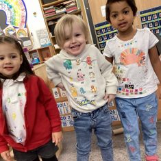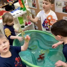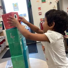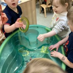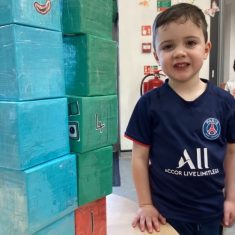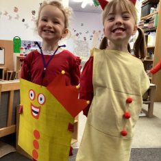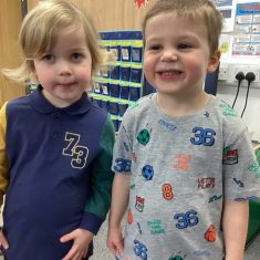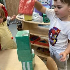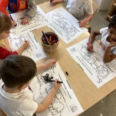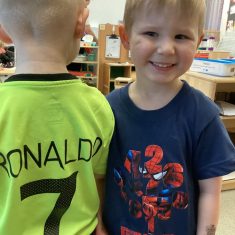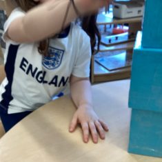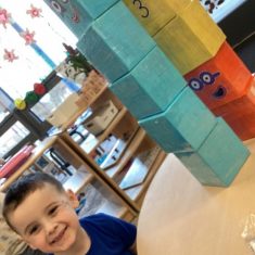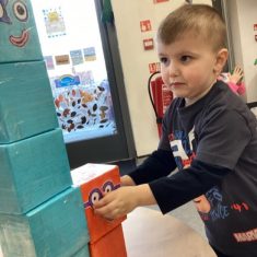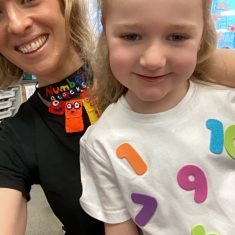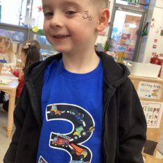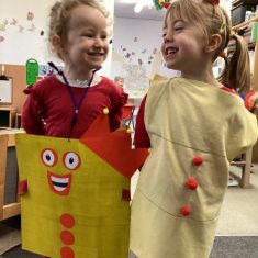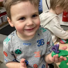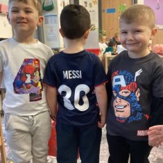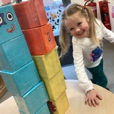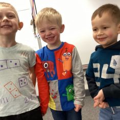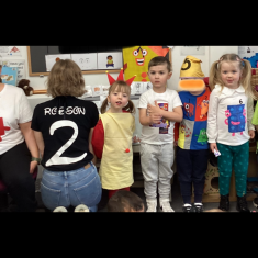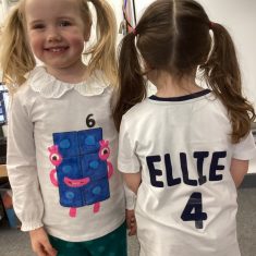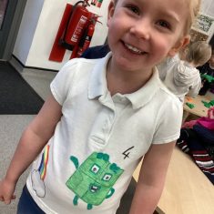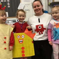 The children loved showing off their number outfits. We enjoyed singing number songs and using numbers in different areas. We made a human number line with the numbers on our outfits from one to seven. In the afternoon we thought about our number of the week, number five. We then used our large numberblocks to try to find different ways to make five. Article 28
