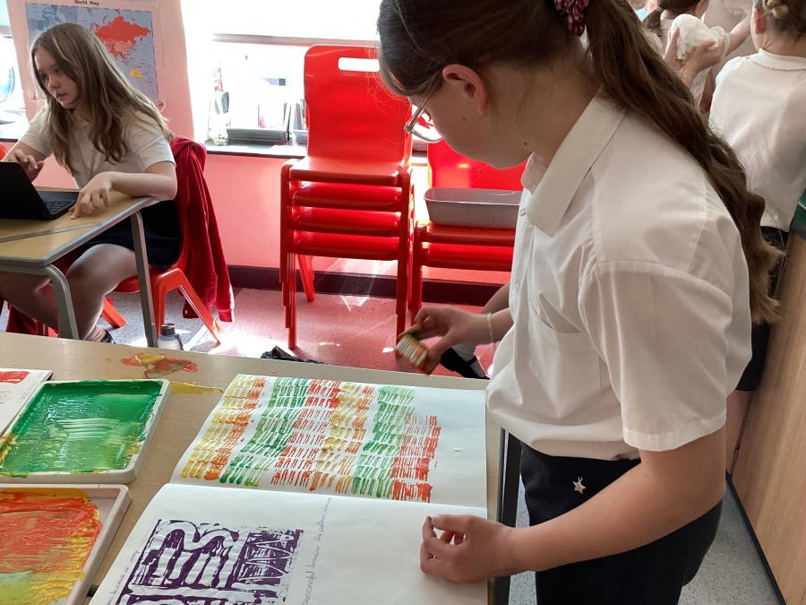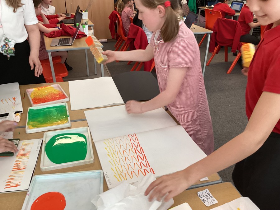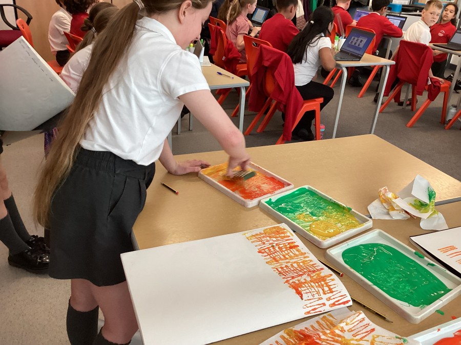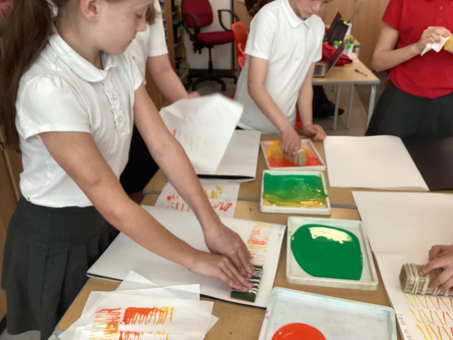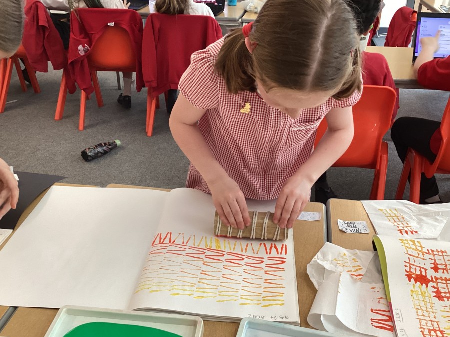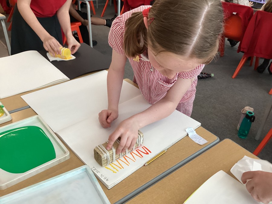 After using mono printing techniques to create an image, the children in Year 5 explored creating string print designs.