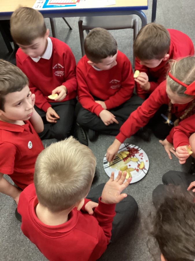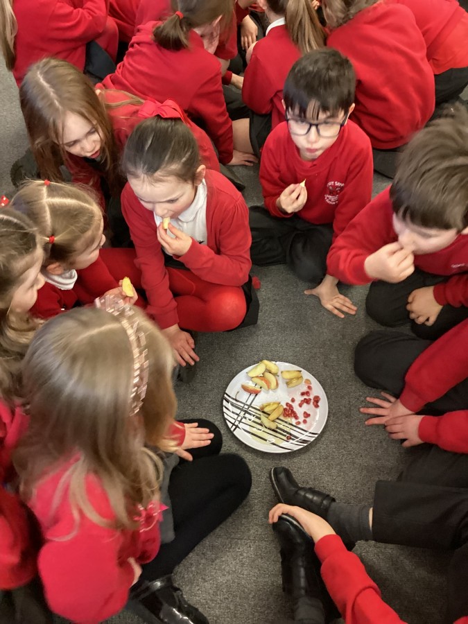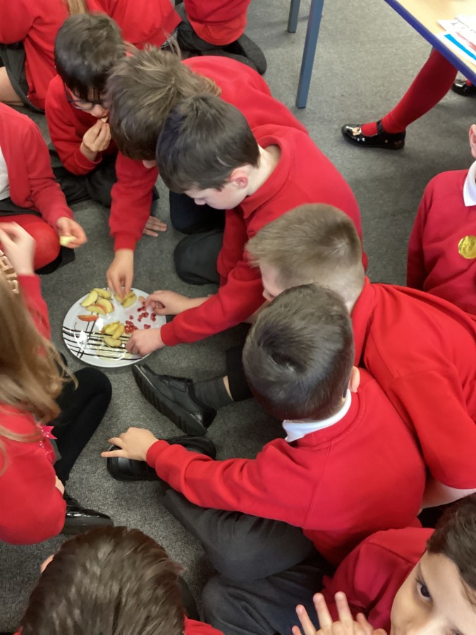 Today we learnt about the Jewish festival of Rosh Hashanah and the different types of food that are eaten to celebrate this festival. Sweet foods like honey and apples are eaten to make people think about the good times to come. Pomegranates are eaten to wish for happiness in the new year. Some us liked these foods, some of us didn’t!