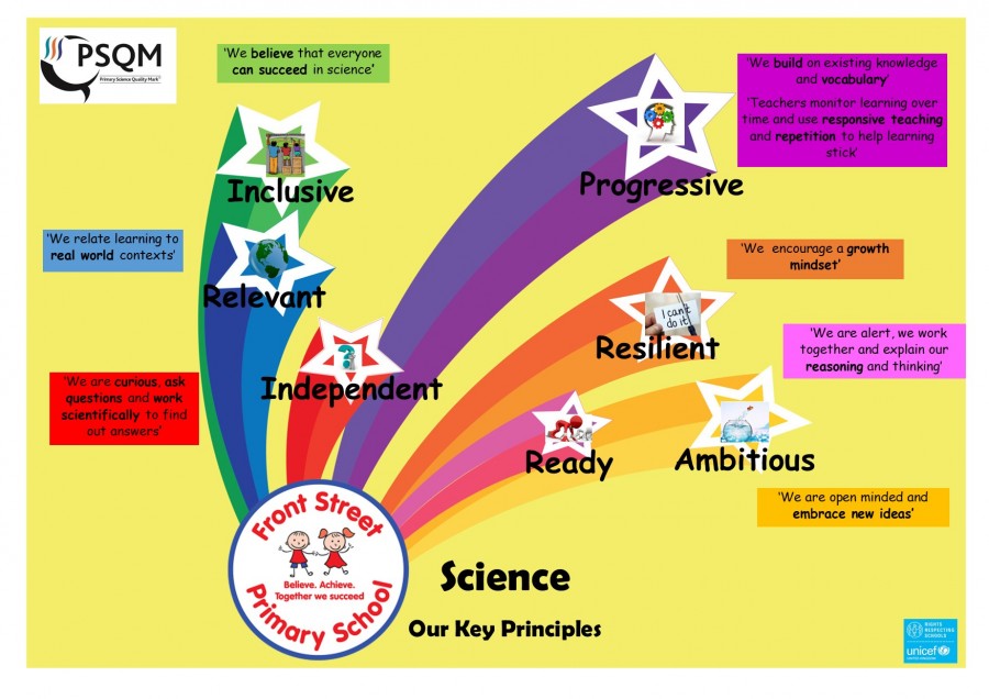 Our science curriculum aims to increase children’s knowledge and understanding of the diverse world they live in and the history of how it has reached its current point. Key enquiry skills are progressive and support increasing independence as children grow in age and confidence. We make relevant links between subjects and the real world, taking into consideration the school’s context, with the ultimate, ambitious and inclusive goal of raising allFront Street children’s future aspirations. Our children are resilient learners. They are taught to have a growth mindset, think critically and their curiosity is stimulated. They build essential cultural capital and by the time they leave our school, they are ready for future learning.