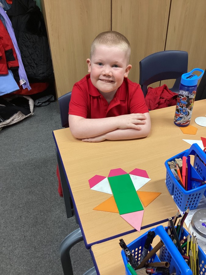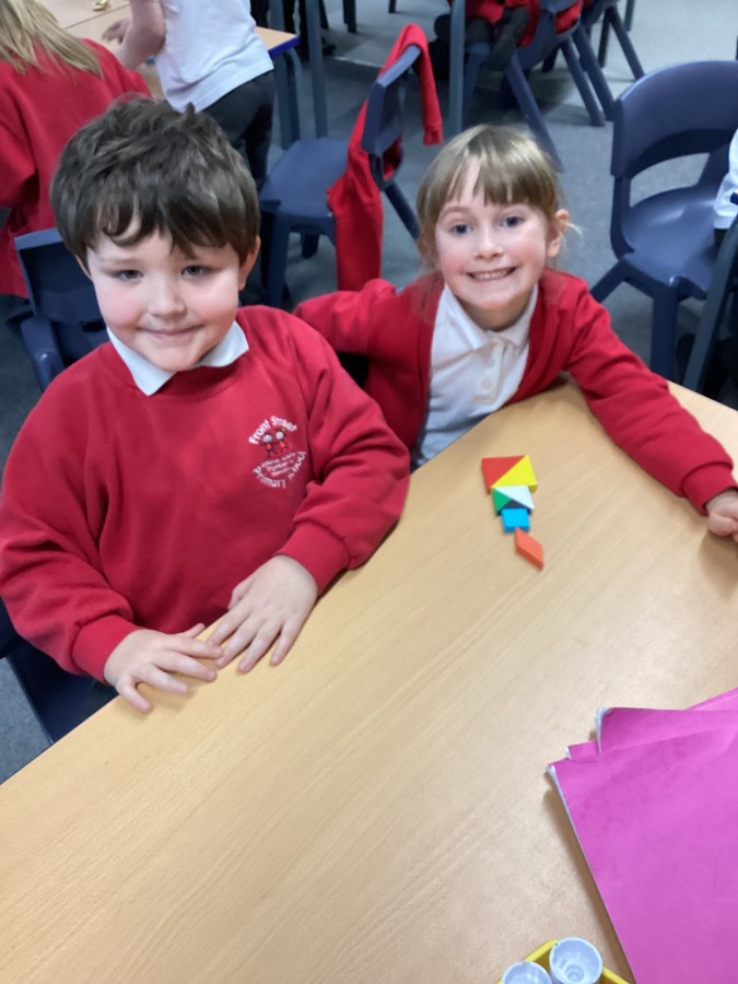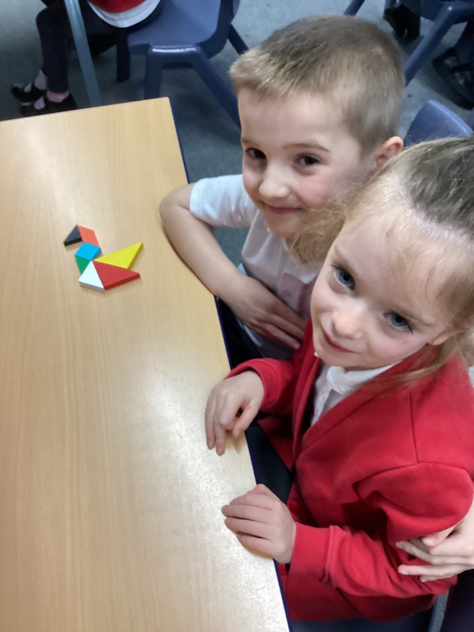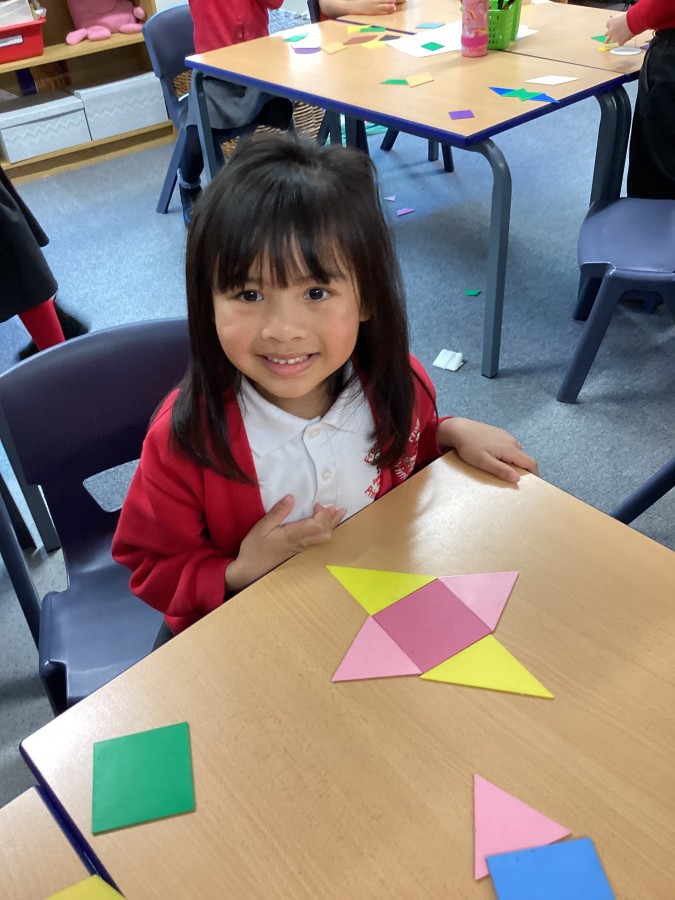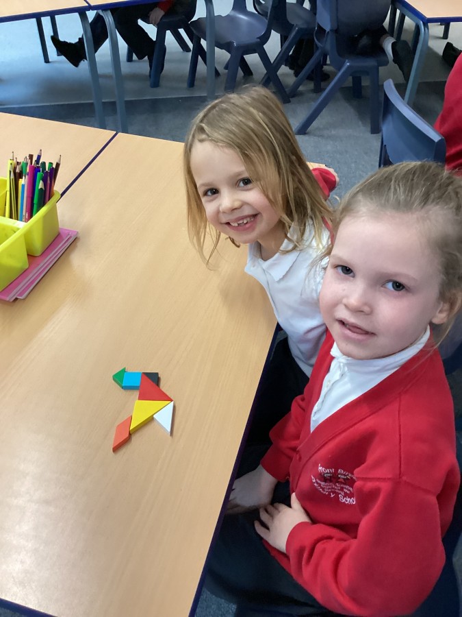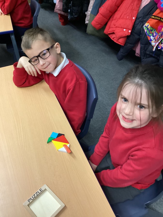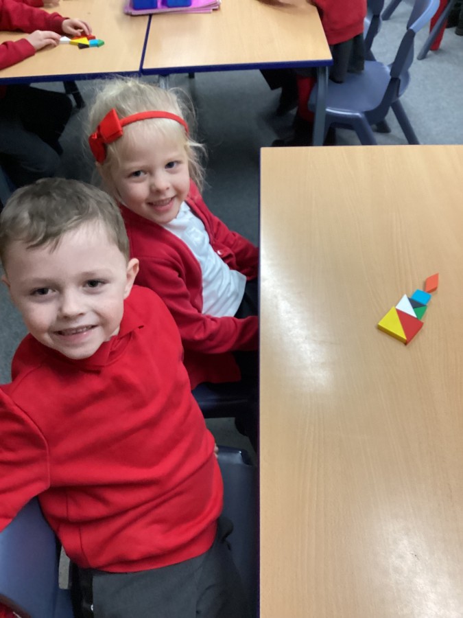 They composed images using 2D shapes, extended and described patterns and used tangrams to make their own pictures of animals and objects they knew.