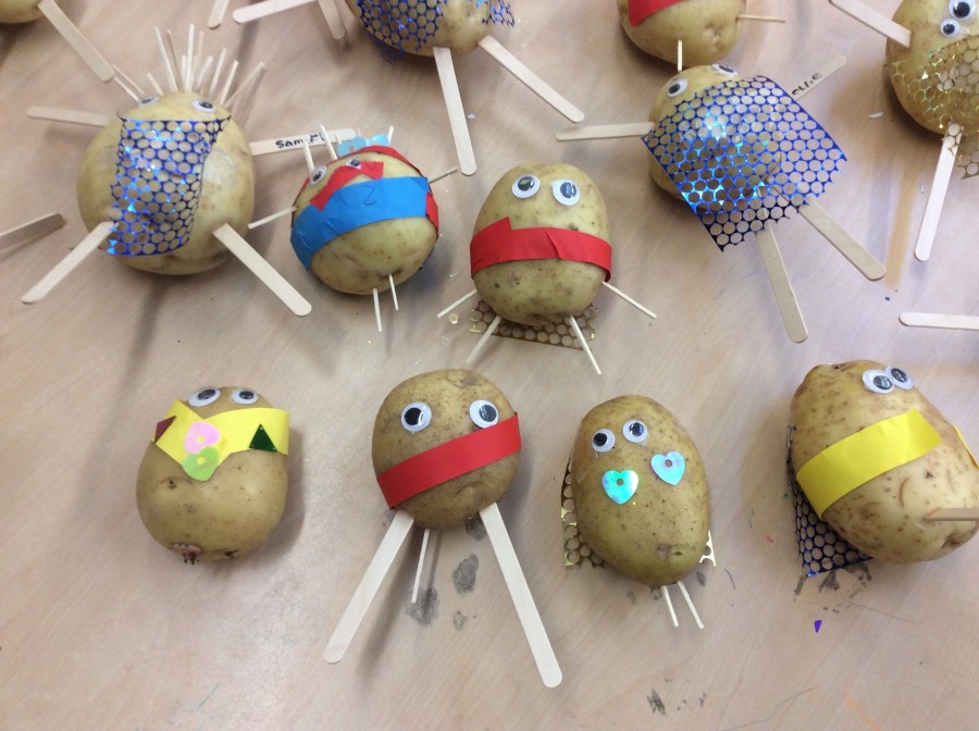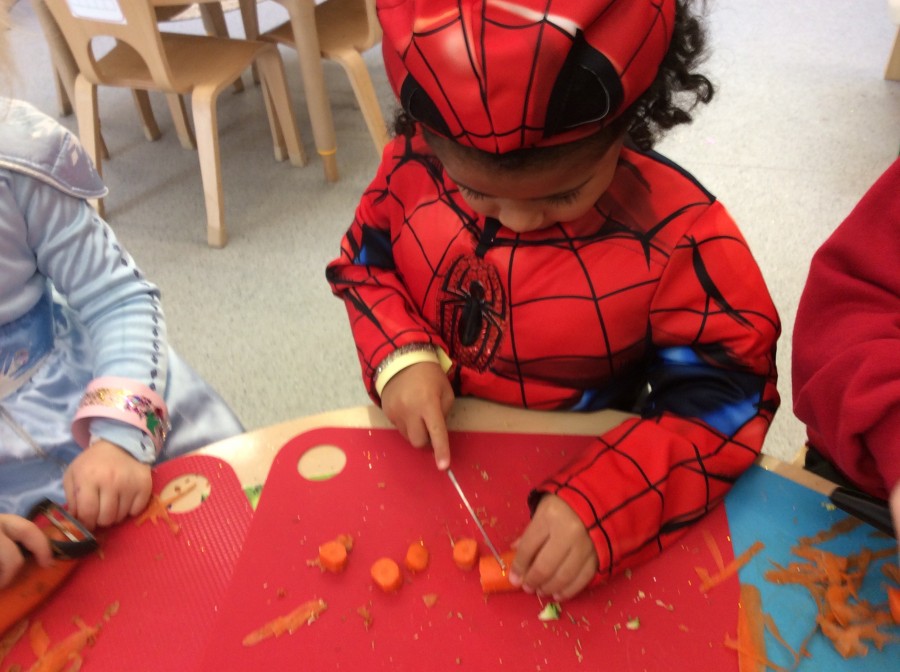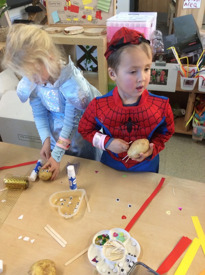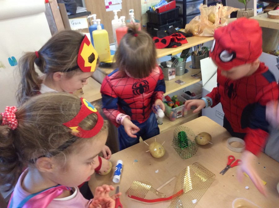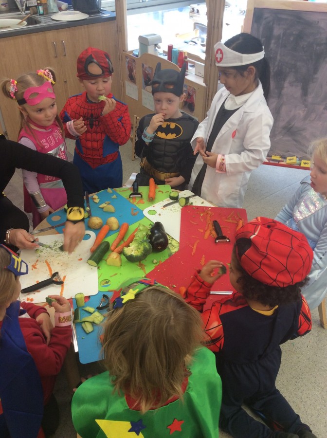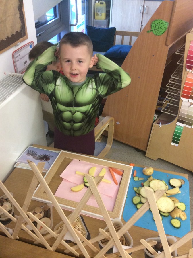 We started off our day with a superhero themed dough disco, we learnt a new sound- ‘h’ for hero, and listened to ‘Supertato’. Then we Took part in a carousel of activities. We made superhero wristbands, chopped up some vegetables (all from the Supertato book), played superhero stuck-in-the-mud, and even made our very own Supertato figures!