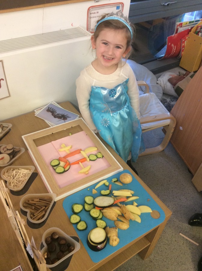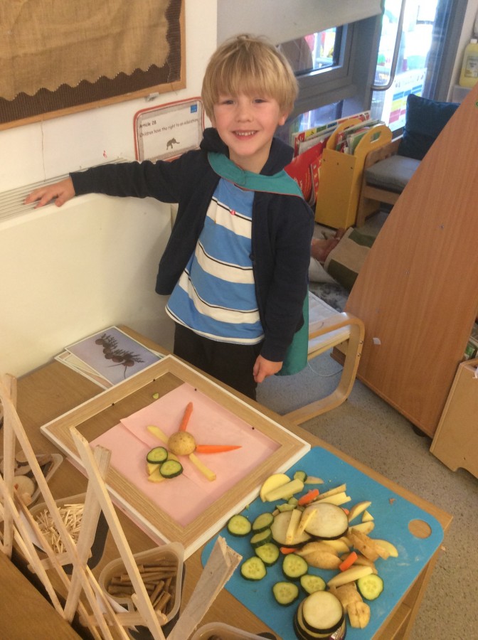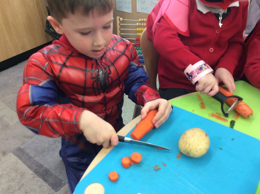 During the afternoon we used our super powers to take part in ‘Make-a-friend-Monday’ and got busy within our class. We made superhero dens, faces from our chopped up vegetables and superhero masks.