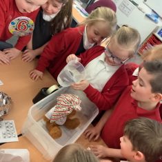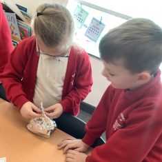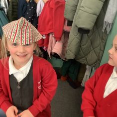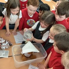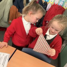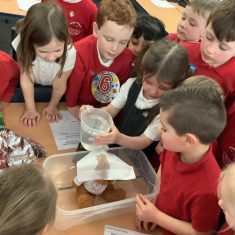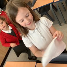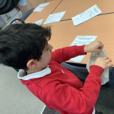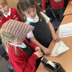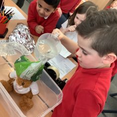 We have been learning all about materials and their properties and exploring which materials are absorbent and which are waterproof. Today our challenge was to find the most suitable material to make a waterproof hat to keep Teddy dry…