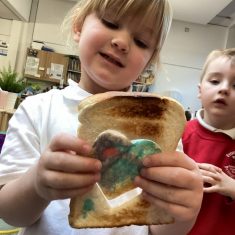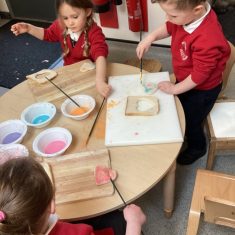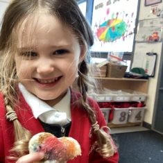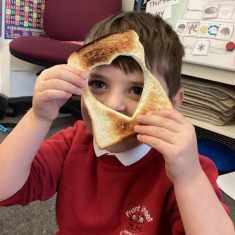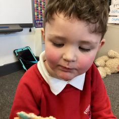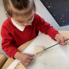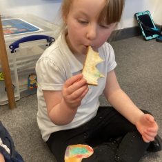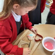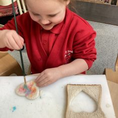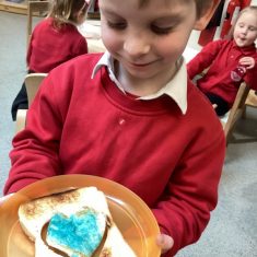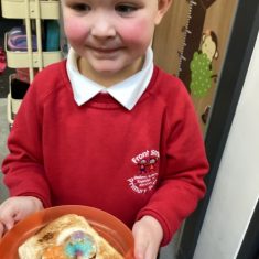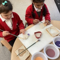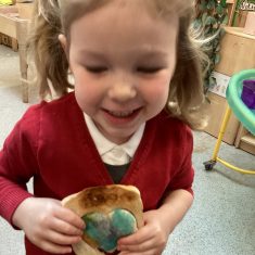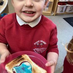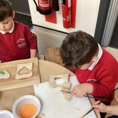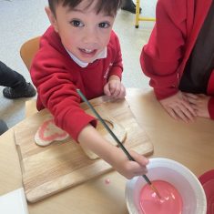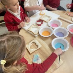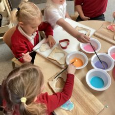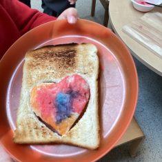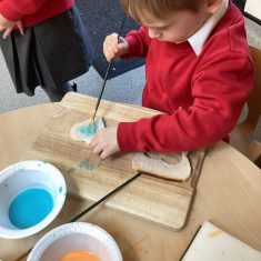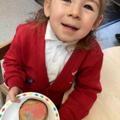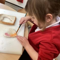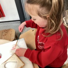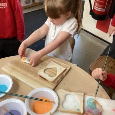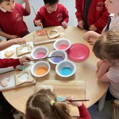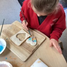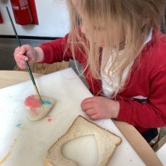Today we talked about Valentine’s Day which is happening on Wednesday. We have enjoyed cutting out hearts, painting hearts and reading stories about people we love. We all really enjoyed cutting out our own bread hearts and then painting them with milk and food colouring.  Everyone agreed they were very tasty! Article 28