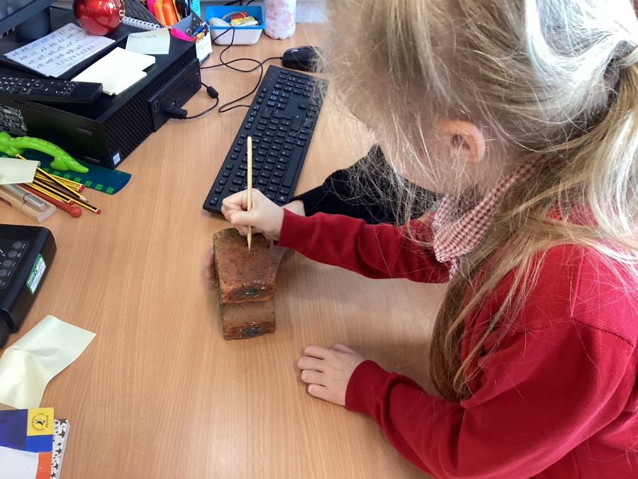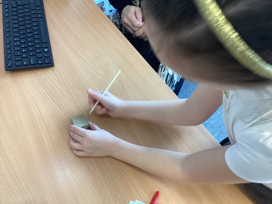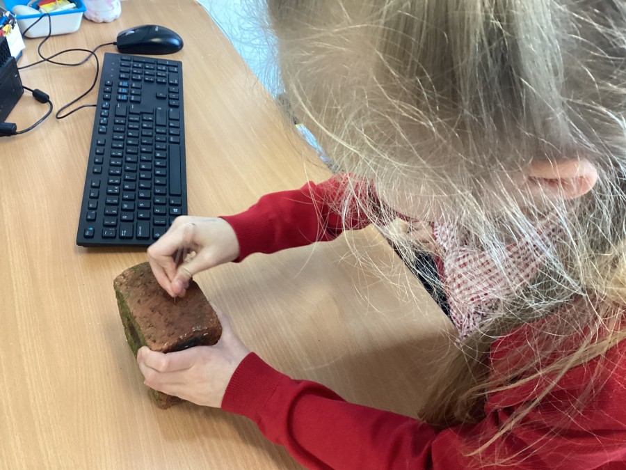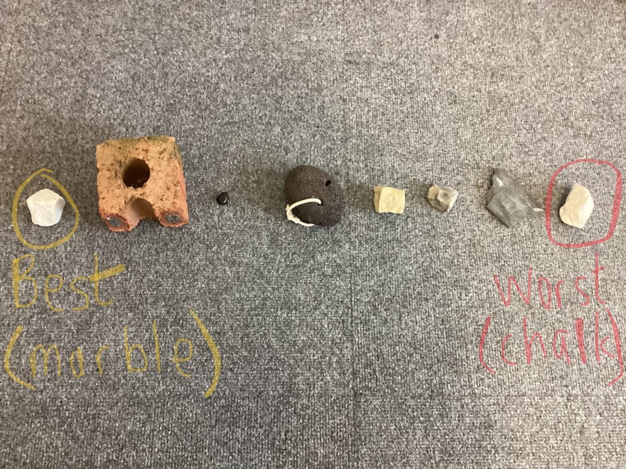 Today, we explored which rocks would make a good surface for a kitchen bench. We performed scratch tests on slate, marble, chalk, brick, flint, pumice, limestone and obsidian. Our results are shown in one of the pictures.