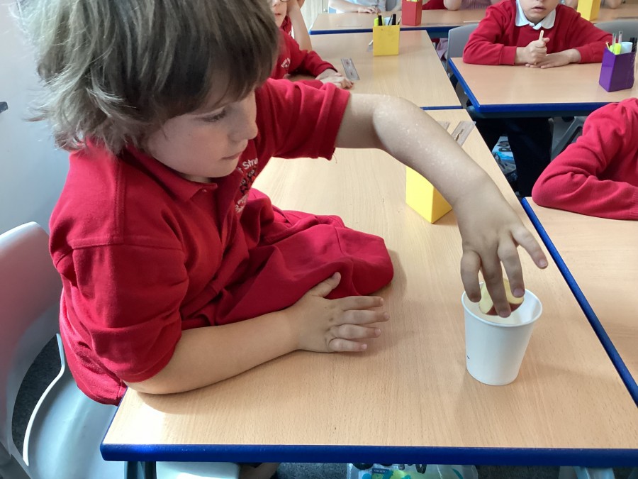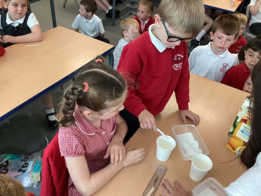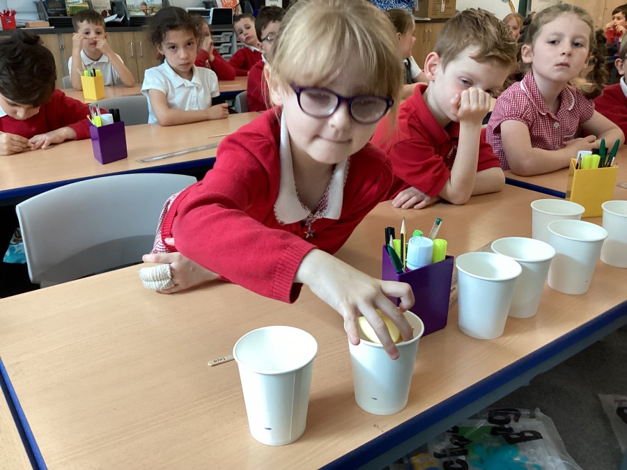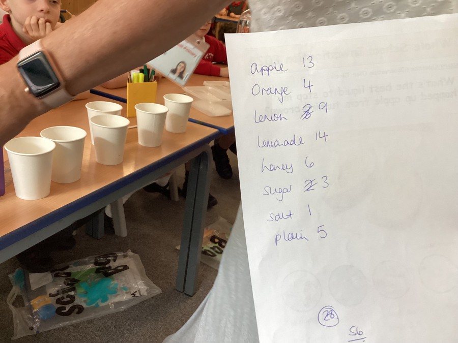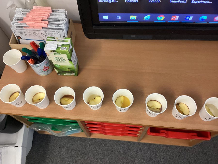As part of their transition days the new Year 2 children investigated which liquid would be the best to stop their apple turning brown.