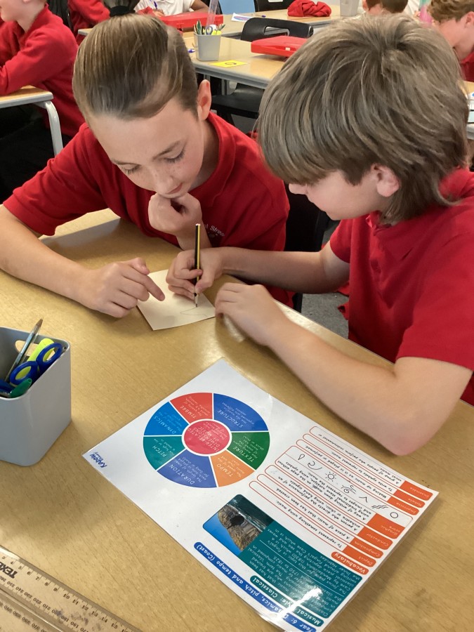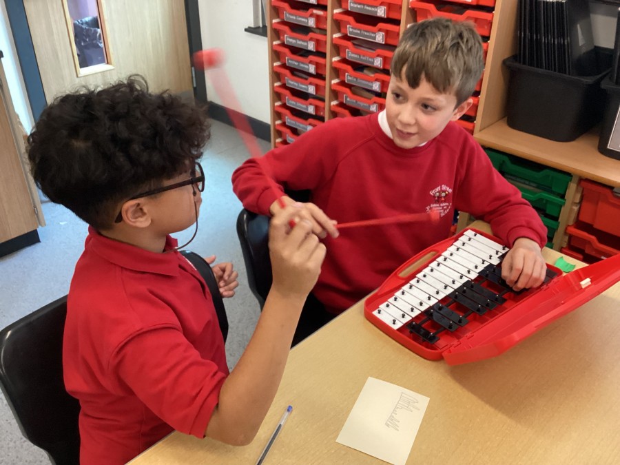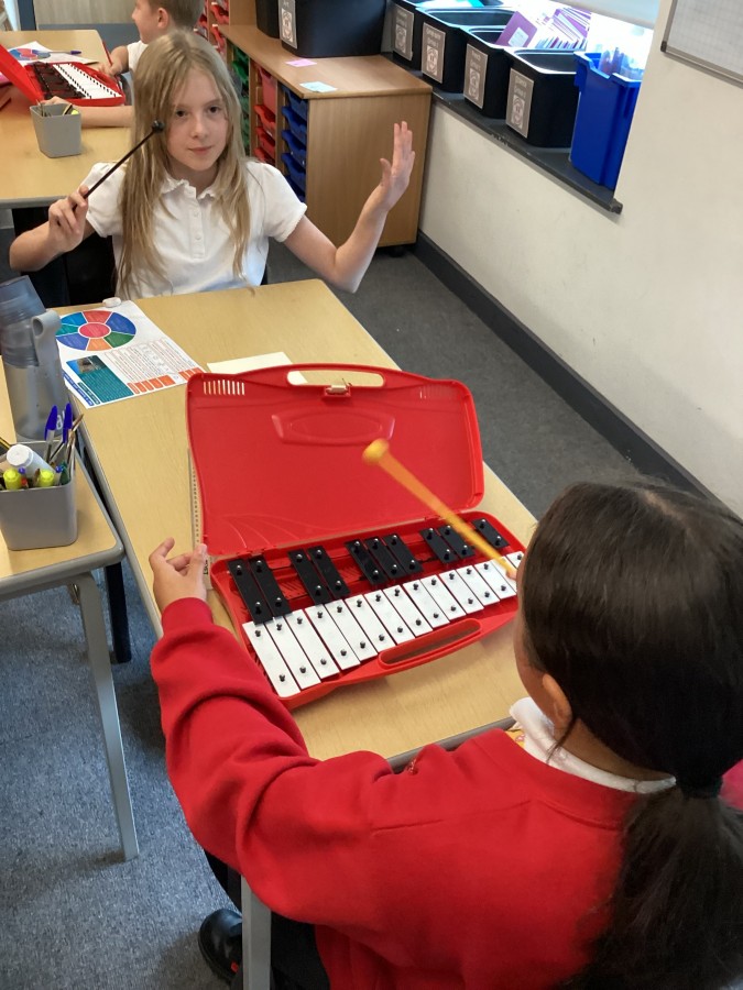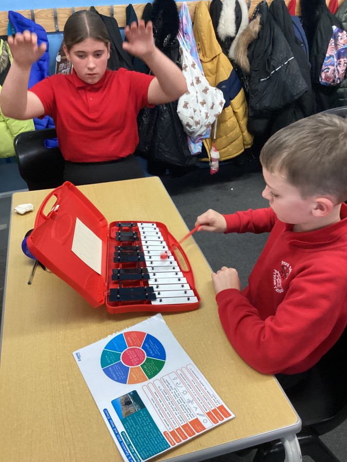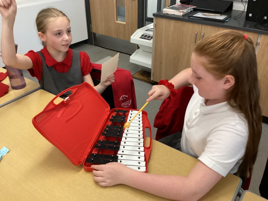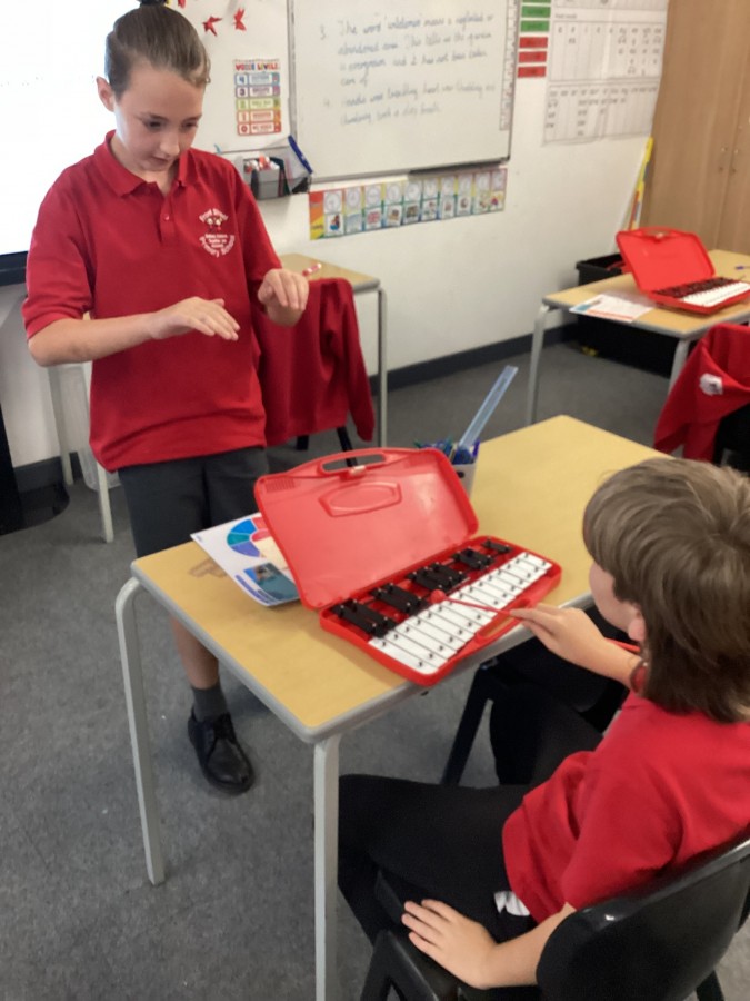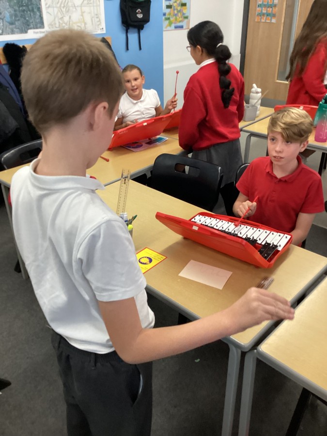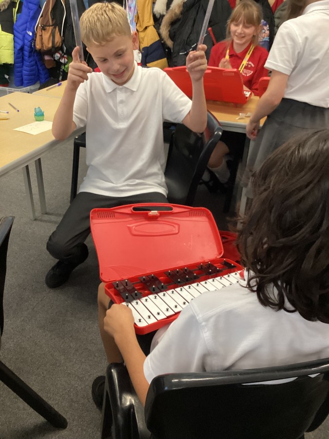 In music lessons, year 6 have been learning about pitch and dynamics. In today’s lesson, they recorded their own graphic scores and then used glockenspiels in a performance. They had to also act as conductors to support their peers during the performances.